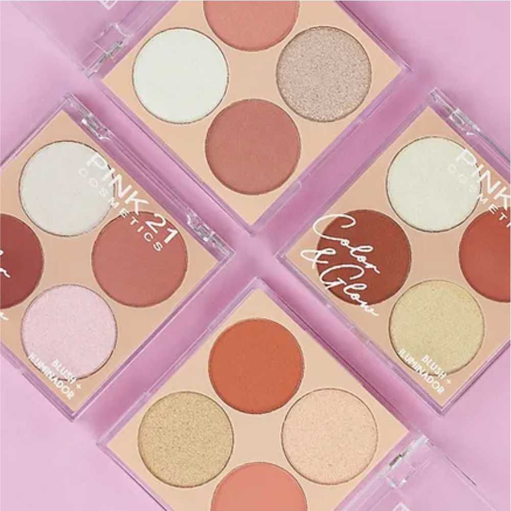 O Quarteto de Iluminador e Blush Color & Glow da Pink 21 possui tons de blush com acabamento matte e iluminadores com efeito espelhado e brilho intenso.Textura aveludada, fácil de esfumar.