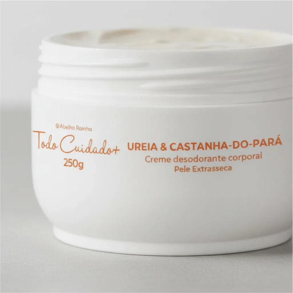 O Creme Hidratante Corporal Ureia & Castanha-do-Pará da linha Todo Cuidado+ Abelha Rainha foi desenvolvido especialmente para atender as necessidades da pele extrasseca e áspera.