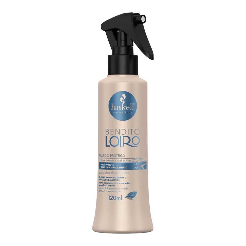 Modo de usar: agite antes de usar. Nos cabelos limpos e úmidos, borrife o Fluido Proteico em todo o comprimento dos fios e espalhe uniformemente pelos cabelos. Finalize como desejar. Sem enxágue. Potencialize os resultados utilizando toda a linha Bendito Loiro.