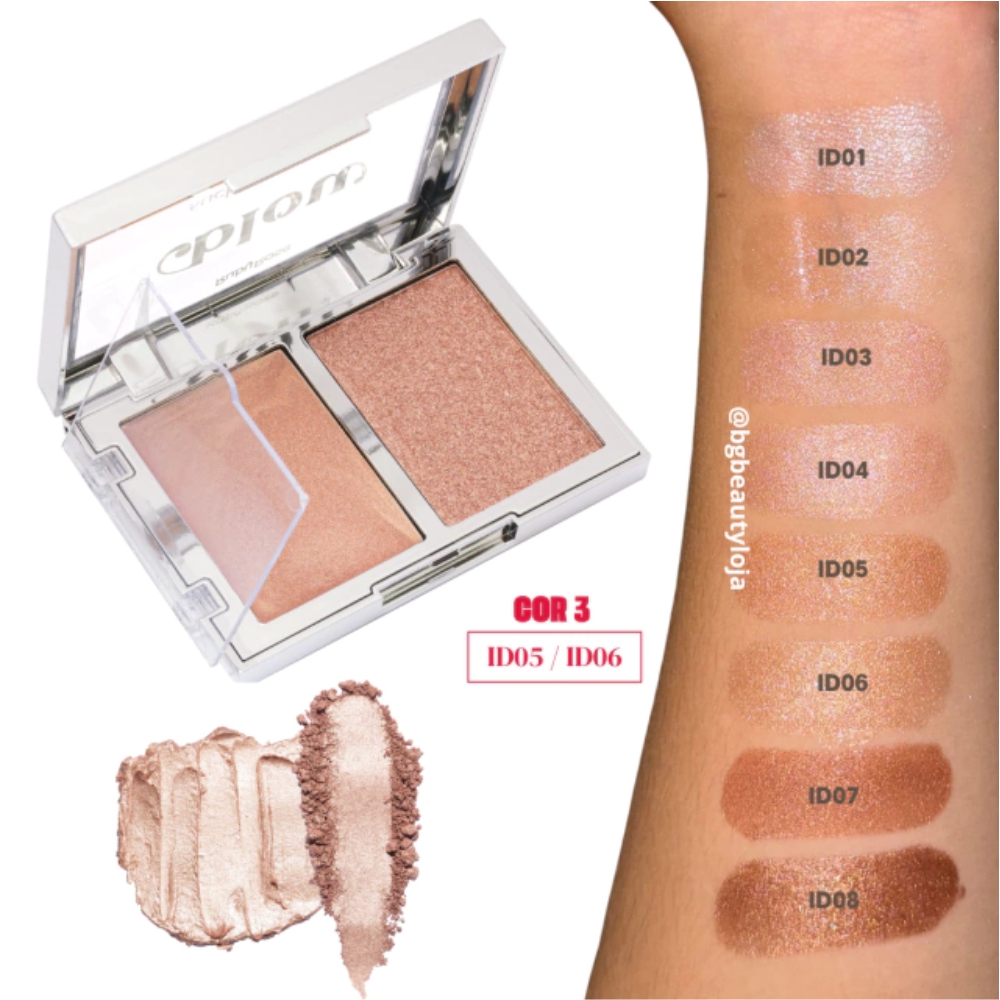Desenvolvido para máxima versatilidade, o Such a Glimmer! combina duas texturas complementares em um único produto. O iluminador cremoso apresenta fórmula ultraleve que se integra perfeitamente à maquiagem, proporcionando efeito de pele molhada e brilho espelhado. Já o iluminadorem pó, com textura macia e toque sedoso, contém partículas refletoras de luz que garantem um acabamento refinado e luminoso, ideal para realçarpontos estratégicos com naturalidade.