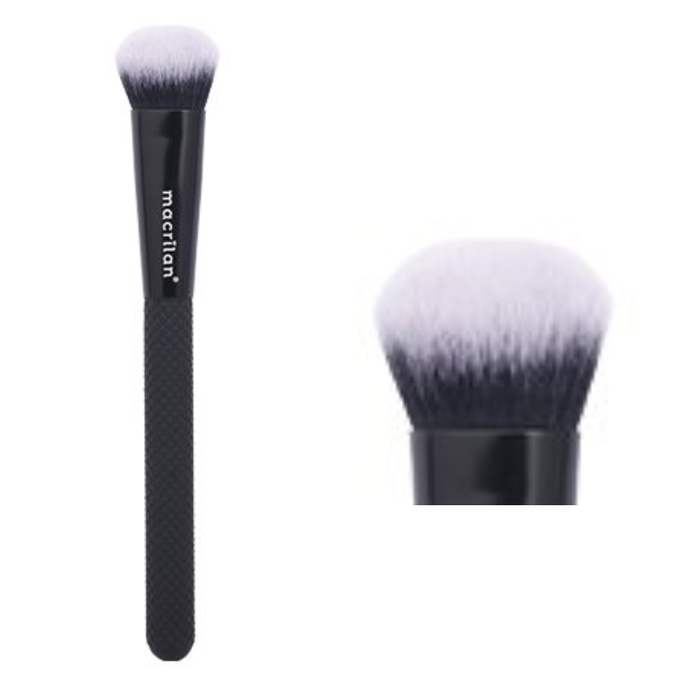 Pincel N05 Macrilan, especialmente desenvolvido com cerdas sintéticas e macias, ideais para aplicação de iluminador ou blush. Seu formato chanfrado facilita a aplicação, que pode ser usado para fazer contorno com maior precisão e garantir um acabamento uniforme.