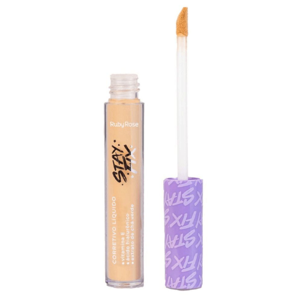 Corretivo Líquido de Longa Duração Stay Fix da Ruby Rose, possui alta cobertura com acabamento maravilhoso e promete longa duração. Por ter uma formulação ser liquida e suave você pode construir camadas sem pesar a make, ele cria uma camada uniforme sobre a pele que disfarça, corrigi manchas e imperfeições sem desaparecer ao longo do dia, sendo resistente as atividades diárias. Com efeito matte o corretivo stay fix é ideal para peles oleosas. Contendo Àcido hialurônico em sua fórmula que ajuda na prevenção dos sinais.
