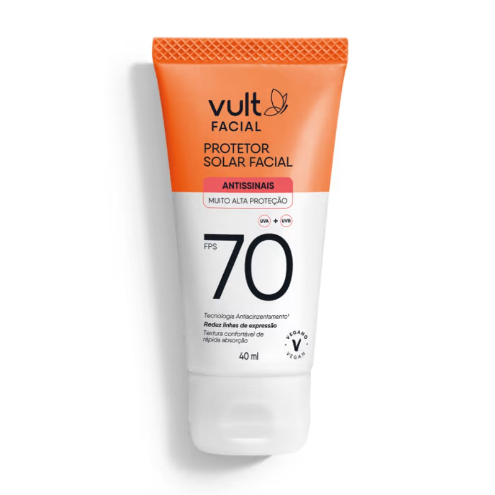 O Protetor Solar Antissinais FPS 70 Vult Facial, além de proteger a pele contra danos causados pelo sol, também reduz a aparência de linhas de expressão, deixando-a mais firme, com acabamento invisível.