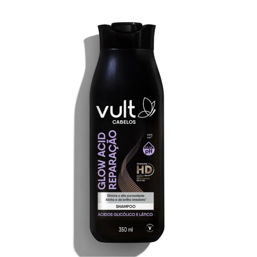 Shampoo Vult Glow Acid Reparação limpa e recupera os fios danificados. Com a poderosa tecnologia HD, realiza uma reparação profunda, proporcionando um brilho intenso e eliminando a alta porosidade, deixando seus fios alinhados e com um toque suave.